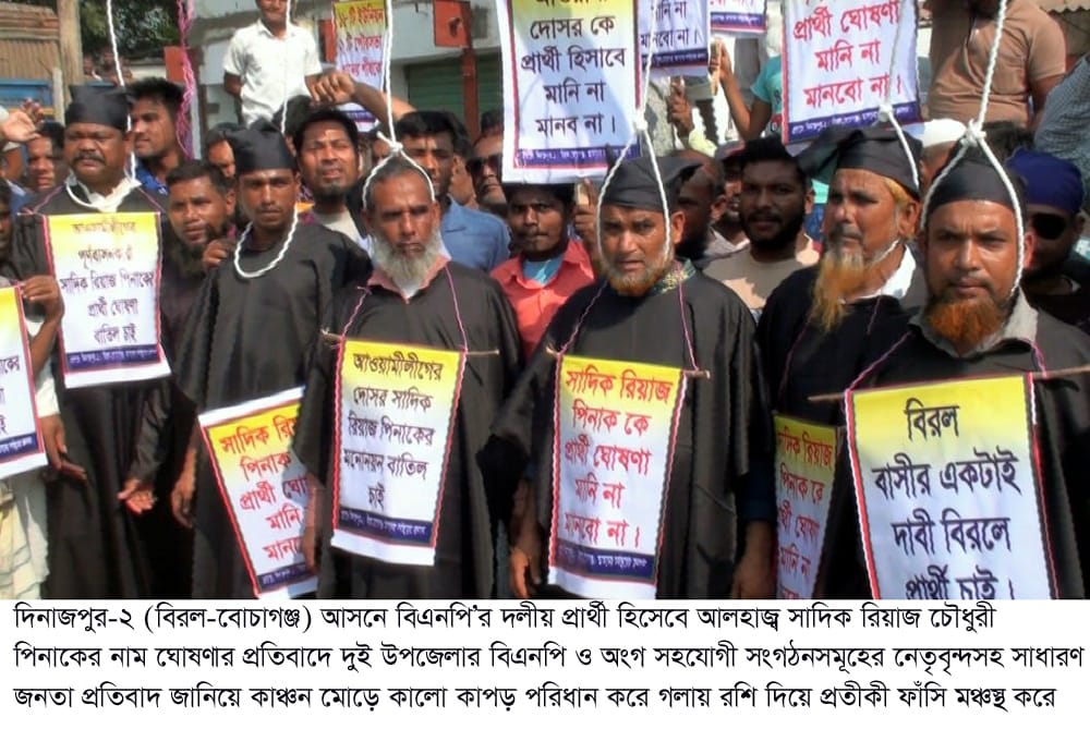 দিনাজপুর-২ (বিরল-বোচাগঞ্জ) আসনে বিএনপি’র দলীয় প্রার্থী হিসেবে আলহাজ সাদিক রিয়াজ চৌধুরী পিনাকের নাম ঘোষণার প্রতিবাদে দুই উপজেলার বিএনপি ও অংগ সহযোগী সংগঠনসমূহের নেতৃবৃন্দসহ সাধারণ জনতা প্রতিবাদ অব্যাহত রেখেছে। এরই মধ্যে বিরল ও বোচাগঞ্জ উপজেলার বিভিন্ন স্থানে মানববন্ধন, বিক্ষোভ মিছিল, মৌনমিছিল, কাফনের কাপড় পরিধানসহ বিভিন্ন কর্মসূচি পালন করেছে।
