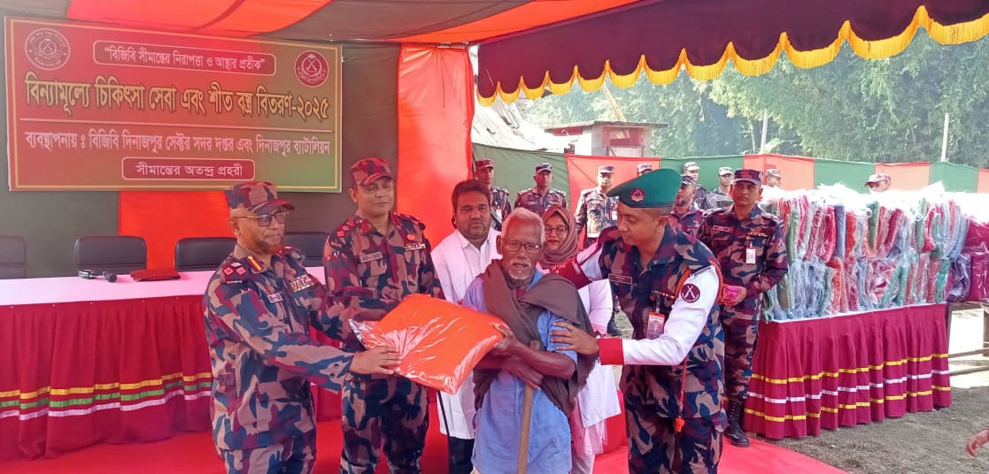 দিনাজপুর ব্যাটালিয়ন (৪২ বিজিবি) এর সার্বিক ব্যবস্থাপনায় বিনামূল্যে চিকিৎসা সেবা এবং শীত বস্ত্র বিতরন-২০২৫ কর্মসূচির আয়োজন করা হয়েছে। ২৯ নভেম্বর ২০২৫ শনিবার সকাল ১০ টায় বিরল উপজেলার ০৮ নং ধর্মপুর ইউনিয়নের ১১৯ নং দক্ষিন মেড়াগাঁও সরকারি প্রাথমিক বিদ্যালয় মাঠে বর্ডার গার্ড বাংলাদেশ এর জনসেবামূলক এই কার্যক্রম পরিচালিত হয়।