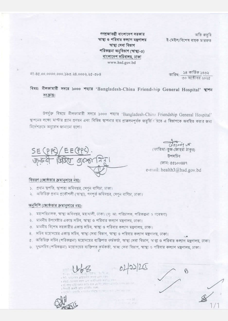 চীনের এক হাজার শয্যা বিশিষ্ট হাসপাতাল নির্মিত হচ্ছে নীলফামারীতে