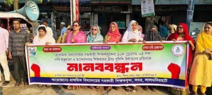 লালমনিরহাটে প্রাথমিক বিদ্যালয়ের সহকারী  শিক্ষকদের ১০ম গ্রেডসহ ৩ দফা দাবির বাস্তবায়ন এবং আন্দোলনরত শিক্ষকদের ওপর পুলিশি নিপীড়নের প্রতিবাদে মানববন্ধন অনুষ্ঠিত হয়েছে। ১০ই নভেম্বর সোমবার  লালমনিরহাট মিশনমোড় চত্বরে এ কর্মসূচিতে জেলার বিভিন্ন বিদ্যালয়ের শিক্ষক ও কর্মচারীরা অংশ নেন।